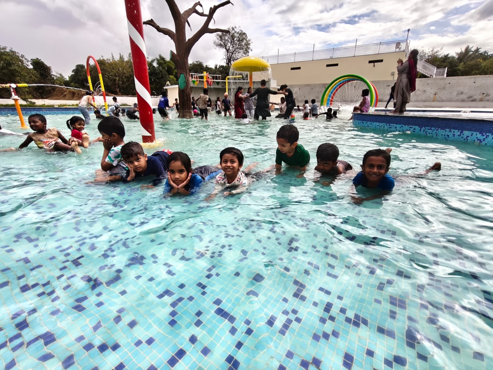 Children arrive in colourful swimwear, eager to experience the "splash pool" environment.